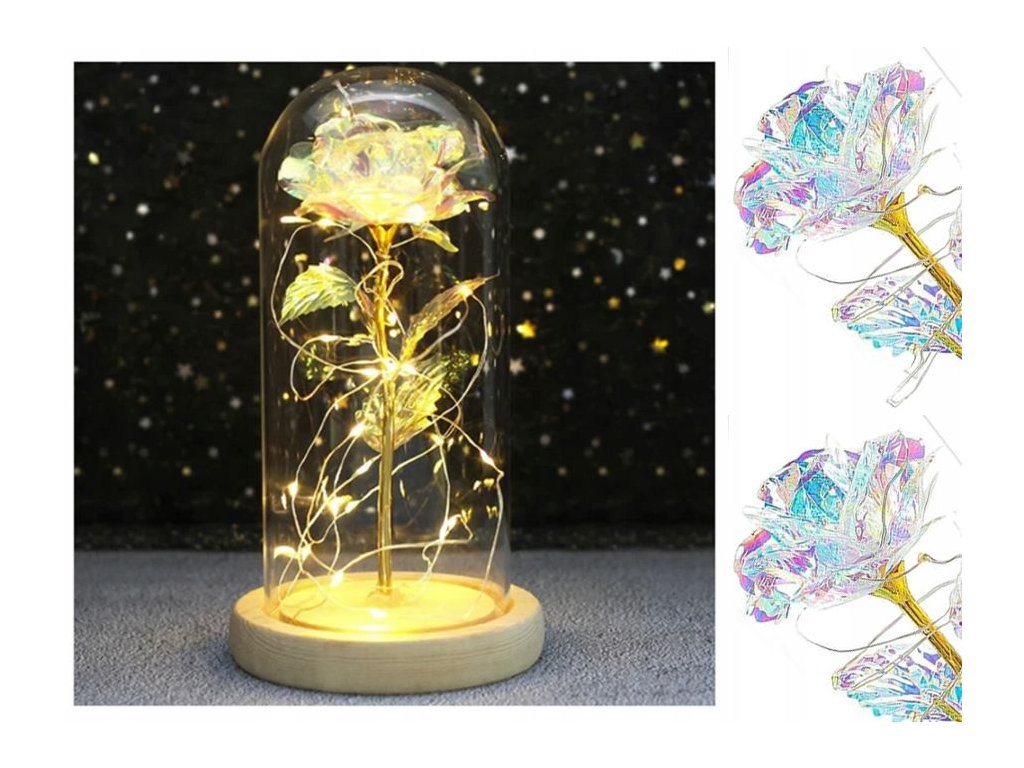 Věčná růže ve skle, RGB LED svítící, dřevěný podstavec