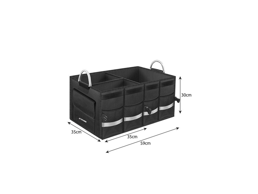 - SPECIFIKACE - barva: černá; vnější materiál: oxford tkanina, ostatní: polyester + nylon, vnitřní materiál: polyester, struktura: MDF, ostatní prvky: hliník + PP + materiál rukojetí: polyester, ostatní: PP + železo; kapacita: 50 l; rozměry rozloženého organizéru: 59 x 30 x 35 cm; hmotnost: 3,20 kg; hmotnost balení: 3,45 kg.