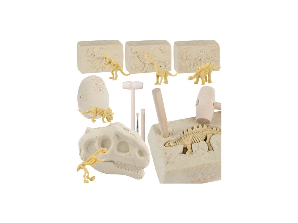 5 úžasných dinosaurů v jedné sadě - uvnitř se nacházejí 3 sádrové bloky, vejce a dinosauří lebka se skrytými kostrami dinosaurů, jako jsou Tyrannosaurus Rex a Triceratops, což zaručuje hodiny fascinující zábavy.
