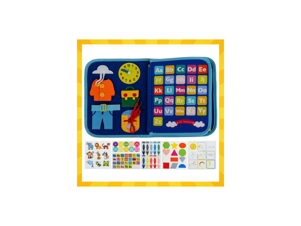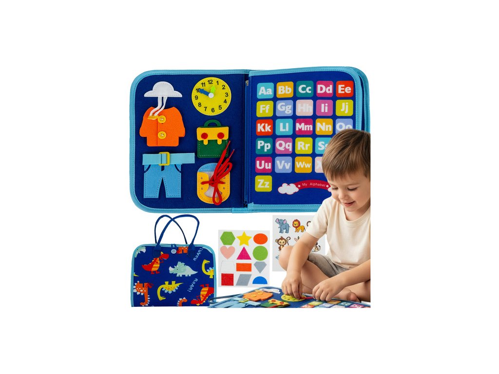 - Dar, který rozvíjí — ideální pro předškoláky: učí počítání, vázání a logické myšlení; manipulační tabule / senzorická kniha.