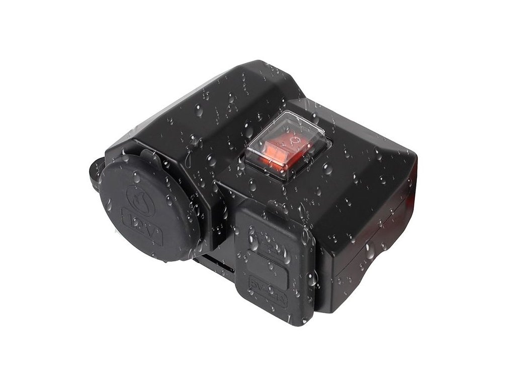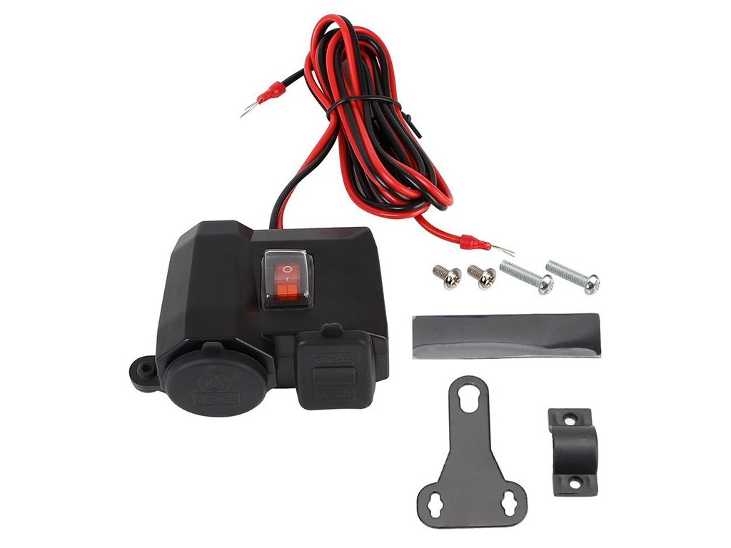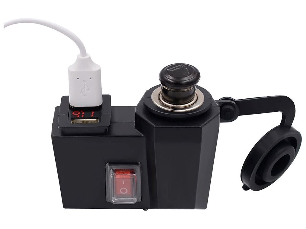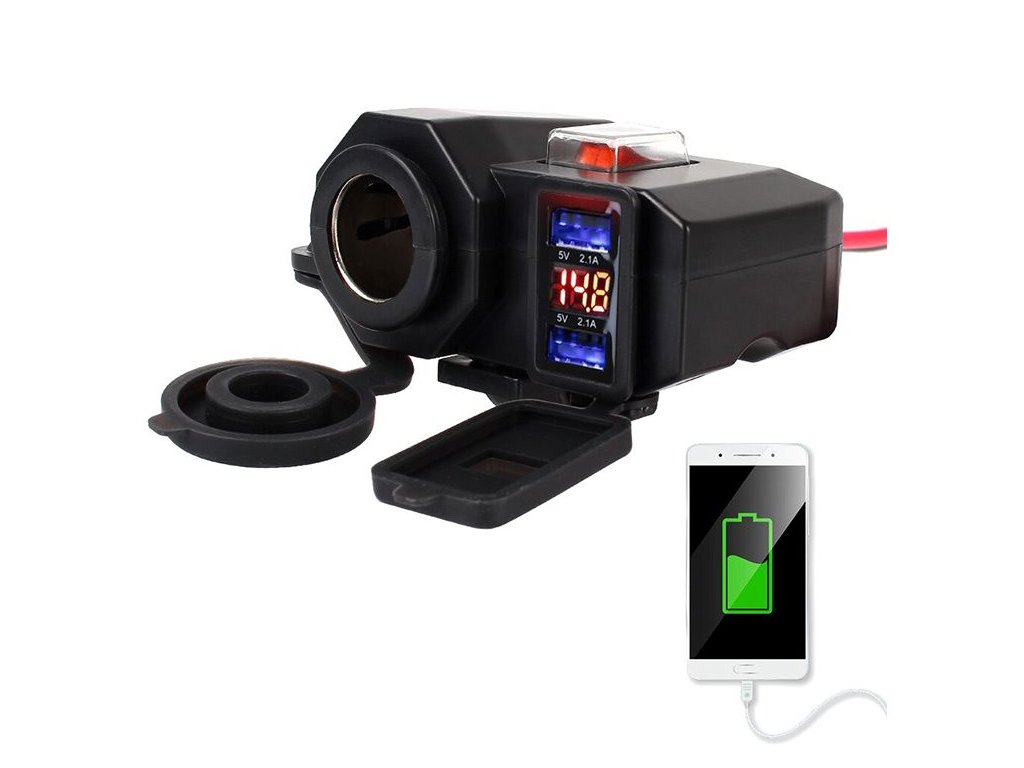 Vodotěsná zásuvka zapalovače pro motocykl, skútr, čtyřkolku. Je vybavenavoltmetrem, který ukazuje napětí při nabíjení baterie. Kromě toho má dva porty USB 2,1 A. Zásuvka má dvě gumové krytky, které ji chrání před nepříznivými povětrnostními podmínkami.