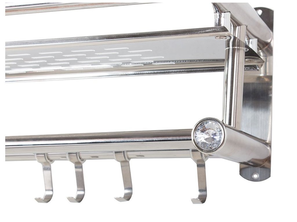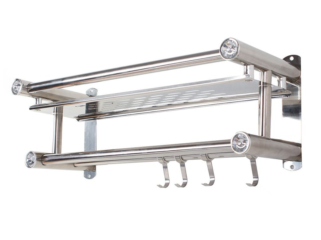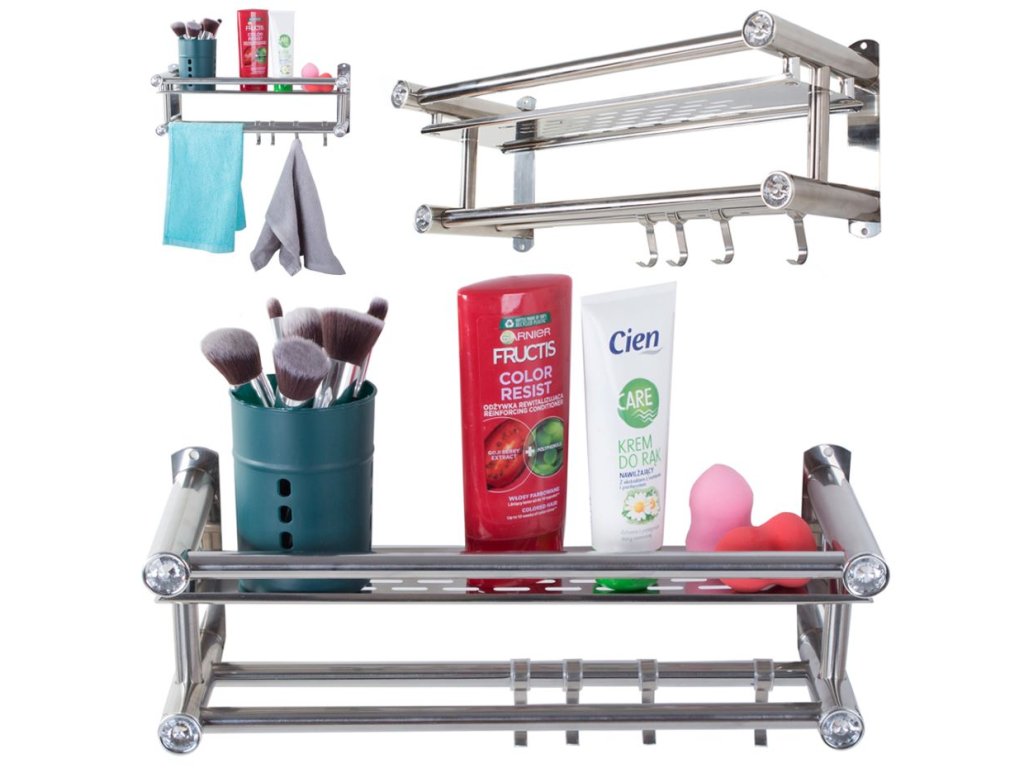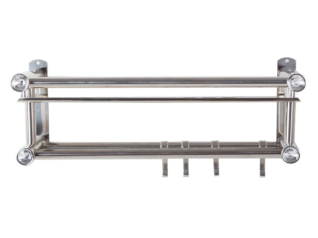 Závěsná, elegantní polička do koupelny ve stříbrné barvě. Regál má prostornou polici na kosmetiku a dvě kolejničky na ručníky . Na jedné z kolejnic jsou čtyři věšáky .